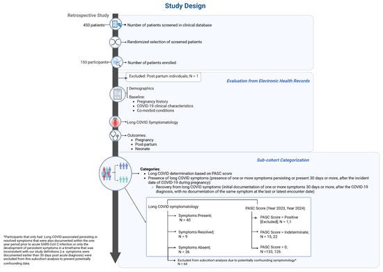 Study Design. In this descriptive study, electronic health records were retrospectively reviewed for 149 pregnant individuals with a history of acute SARS-CoV-2 infection during pregnancy, observing for Long COVID symptoms and assessing for adverse outcomes. Participants were classified according to two different classification systems, either based on overall Long COVID symptomatology or a PASC score derived from the NIH RECOVER protocol. Figure created using the web-based application, BioRender. Adeyemi, C. (2025) https://BioRender.com/g0xjvir (accessed on 30 September 2025).