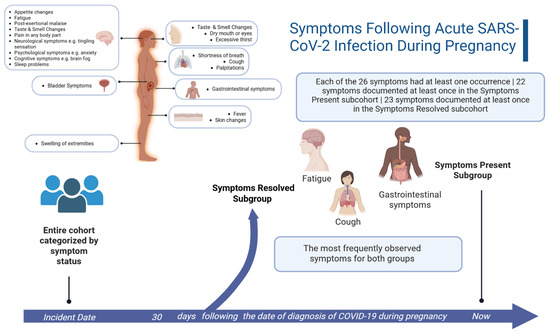 Symptoms Following Acute SARS-CoV-2 Infection During Pregnancy. Participants were classified based on overall Long COVID symptomatology based on a retrospective EHR analysis for observed documentation of 26 different symptoms. For those classified as Symptoms Present, our study design required that the symptom be present at both 30 days or morefollowing the acute COVID-19 and remain documented at the final encounter in the study period; if the symptom was no longer documented at the final encounter, the participant was classified as Symptoms Resolved. Figure created using the web-based application, BioRender. Adeyemi, C. (2025) https://BioRender.com/r8gb1n6 (accessed on 30 September 2025).