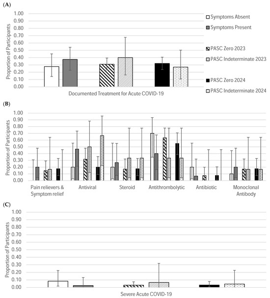 Observed Proportions of Acute COVID-19 Treatment History and Severity. (A) For each subgroup, the observed proportions of participants for whom treatment for acute COVID-19 was documented are reported. (B) Of those who had documented treatment, the observed proportion of the different treatment options given is also reported. (C) For each subgroup, the observed proportions of severe acute COVID-19 are reported. Corresponding 95% confidence intervals are shown to convey the precision of the estimates. The chart legend provided in panel A corresponds to all three panels. The order of the chart legend entries (listed vertically) corresponds to the order of data categories shown in the graph (left to right).