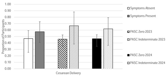 The most notable trends between subcohorts were related to treatment patterns for acute COVID-19, vaccine status, and cesarean delivery rates. Participants in the Symptoms Absent subcohort had less frequently received treatment for their SARS-CoV-2 infections compared to those in the Symptoms Present group. Additionally, a higher proportion of participants in either the Symptoms Present, Symptoms Resolved, or PASC Indeterminate subcohorts had either declined SARS-CoV-2 vaccination or had received their vaccine following their COVID-19 diagnosis during pregnancy compared to the Long COVID Absent or PASC Zero cohorts. This finding suggests a connection between vaccination status and persistence of symptoms following acute infection in pregnant individuals. Although no inferential statistical analyses were performed in this descriptive study, including adjustments for potential confounders such as comorbidities or access to care, this observation is consistent with previous reports in the literature that support vaccination as an effective approach for reducing the risk of Long COVID [40]. Finally, overall, cesarean deliveries were unusually high in our cohort compared to national rates [41]. It is well-documented, however, that pregnant individuals of color tend to have higher rates of cesarean delivery in the United States compared to White individuals, which is a disparity that is not only a significant public health concern but also may introduce a confounding variable when evaluating the impact of Long COVID on labor and delivery outcomes in our cohort [41]. Furthermore, there are known adverse outcomes attributed to cesarean delivery, which can further confound our analysis due to the high rates observed in all cohorts, even those without persistent symptoms.