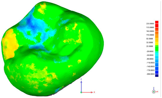 After the chewing simulation, a second intraoral scan was performed using the Medit i700. To evaluate surface wear and restoration integrity, the pre- and post-simulation digital models were superimposed with Geomagic Qualify software, version Qualify 2013 (Geomagic, Inc., Research Triangle Park, Morrisville, NC, USA). This enabled precise measurement of volumetric loss, as shown in Figure 3.