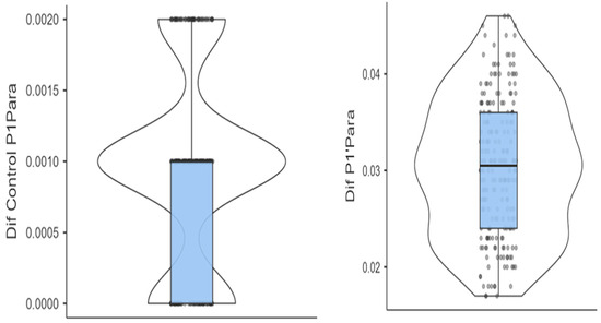 The robust analysis yielded statistically significant results for both experimental groups. In the P1′ PF group, the adjusted mean difference relative to control was −0.0294 mm (p < 0.001, 95% CI: −0.0306 to −0.0281), while in the P2′ FF group, the robust mean difference was −0.0115 mm (p < 0.001, 95% CI: −0.0121 to −0.0109).