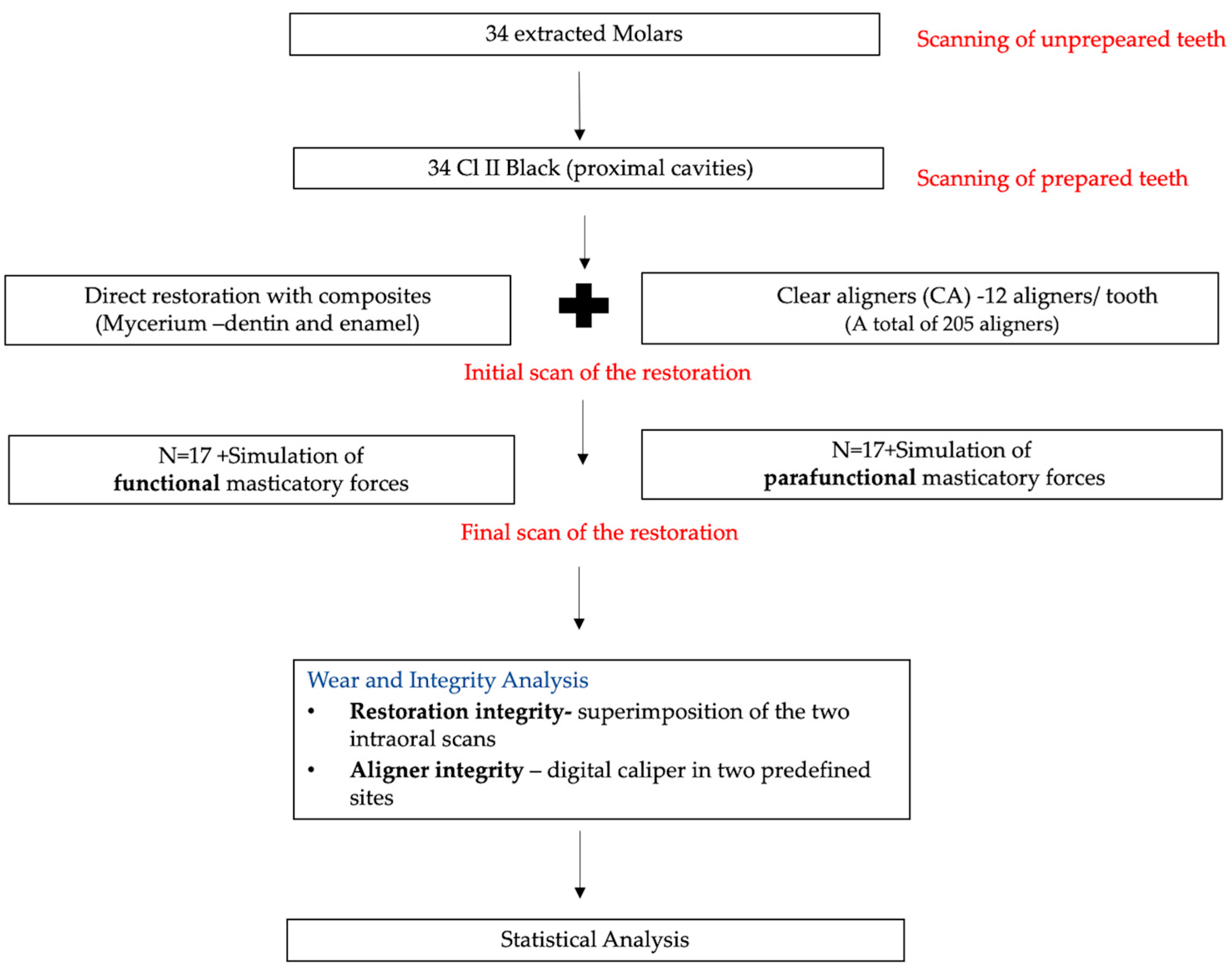 (1) Simulated parafunctional forces have a similar effect as functional forces on the integrity of Class II restored teeth covered by orthodontic aligners.