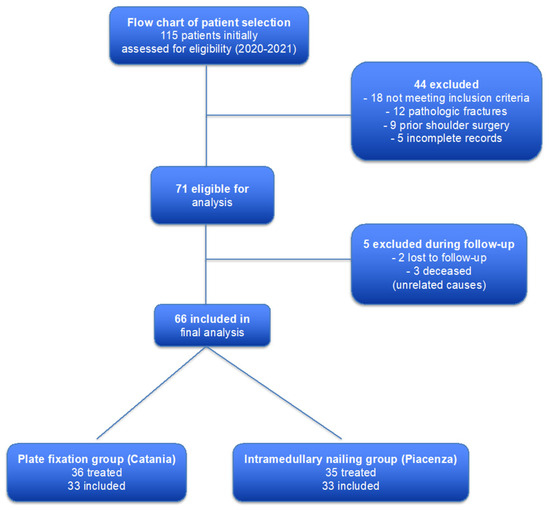 In Catania, 36 patients were treated with minimally invasive plating, whereas in Piacenza, 35 patients underwent intramedullary nailing. A total of 71 patients (61.7% of the total) were initially enrolled. Fracture classification according to Hertel revealed 27 type 7 patterns (38.0%), 18 type 8 (25.3%), 15 type 9 (21.1%), 7 type 10 (8.8%), and 4 type 11 (5.6%). Among these, 35 patients (49.3%) underwent intramedullary nailing and 36 (50.7%) plate fixation. Five patients were excluded during the observation period due to loss to follow-up (two cases) or death from unrelated causes (three cases). The final sample therefore consisted of 66 patients (mean age 67.8 ± 4.19 years), evenly distributed between the two treatment groups (n = 33 per group) (Figure 1).
