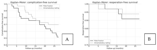 Figure 3. Kaplan–Meier analysis for (A) complication-free survival and (B) reoperation-free survival. Solid line: plate fixation; dashed line: intramedullary nailing. Legend positions and censoring markers are standardized across panels. No significant differences were observed (log-rank p = 0.29 and p = 0.47, respectively).