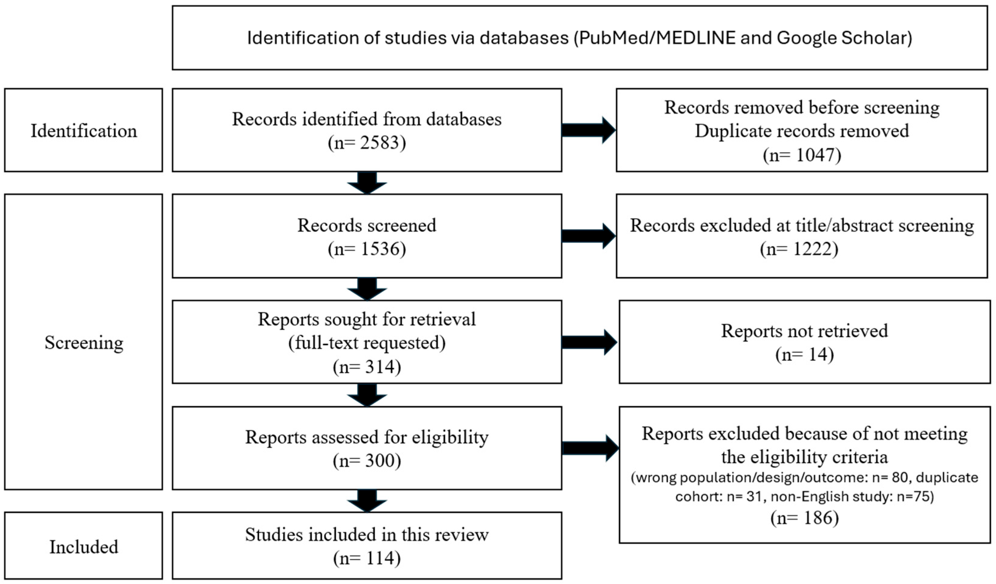 The search identified 2583 records overall; following deduplication and exclusion, 114 studies met the inclusion criteria and were synthesized. Of these 114 studies, 1 is LOE I, 21 are LOE II, 28 are LOE III, 38 are LOE IV, and 26 are LOE V; 28 compare UKA vs. HTO, 4 compare HTO vs. PFO, 28 are various HTO studies, 9 are various UKA studies, and 35 are various PFO studies (LOE = level of evidence). All included articles were compiled into a Master Table S1 and are presented as Supplementary Materials at the end of the study. The List of Abbreviations is provided before the References. A PRISMA-style flow diagram of study selection (1 January 2000–30 August 2025; last search 30 August 2025) is presented as Figure 1. Indications/contraindications and selection signals for HTO, UKA, and PFO for medial-compartment knee OA are presented in Table S2, and key complications by procedure are presented in Table S3.