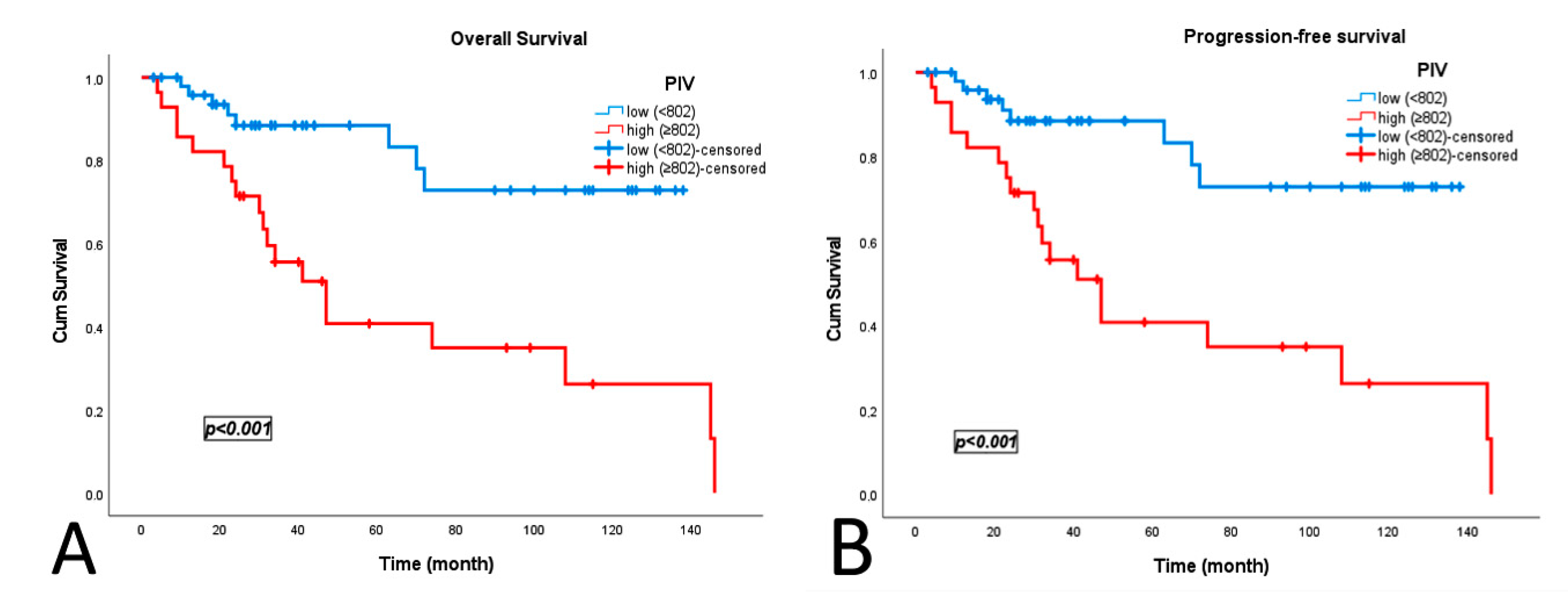 | PIV ≥ 802 | 4.54 | 1.96–10.47 | <0.001 | 4.02 | 1.73–9.32 | 0.001 |