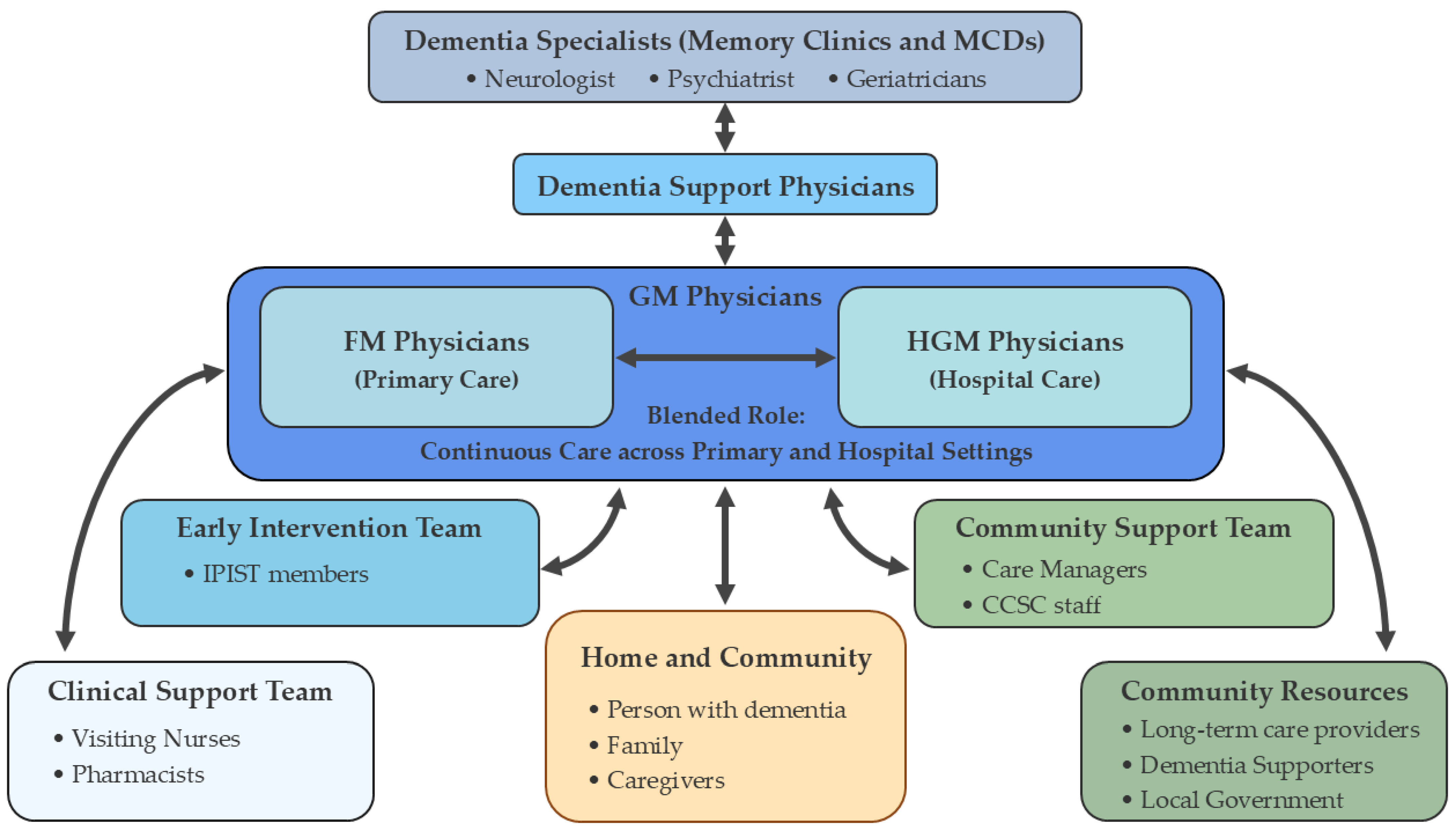 | Primary Care Providers | Kakaritsuke physicians; GM physicians (emerging role) | PCPs as the first contact; refer to specialists; hospitalists manage inpatient care | GPs; initial assessment and referral to memory clinics | FPs as first contact; collaborative Primary Care Memory Clinics expanding |