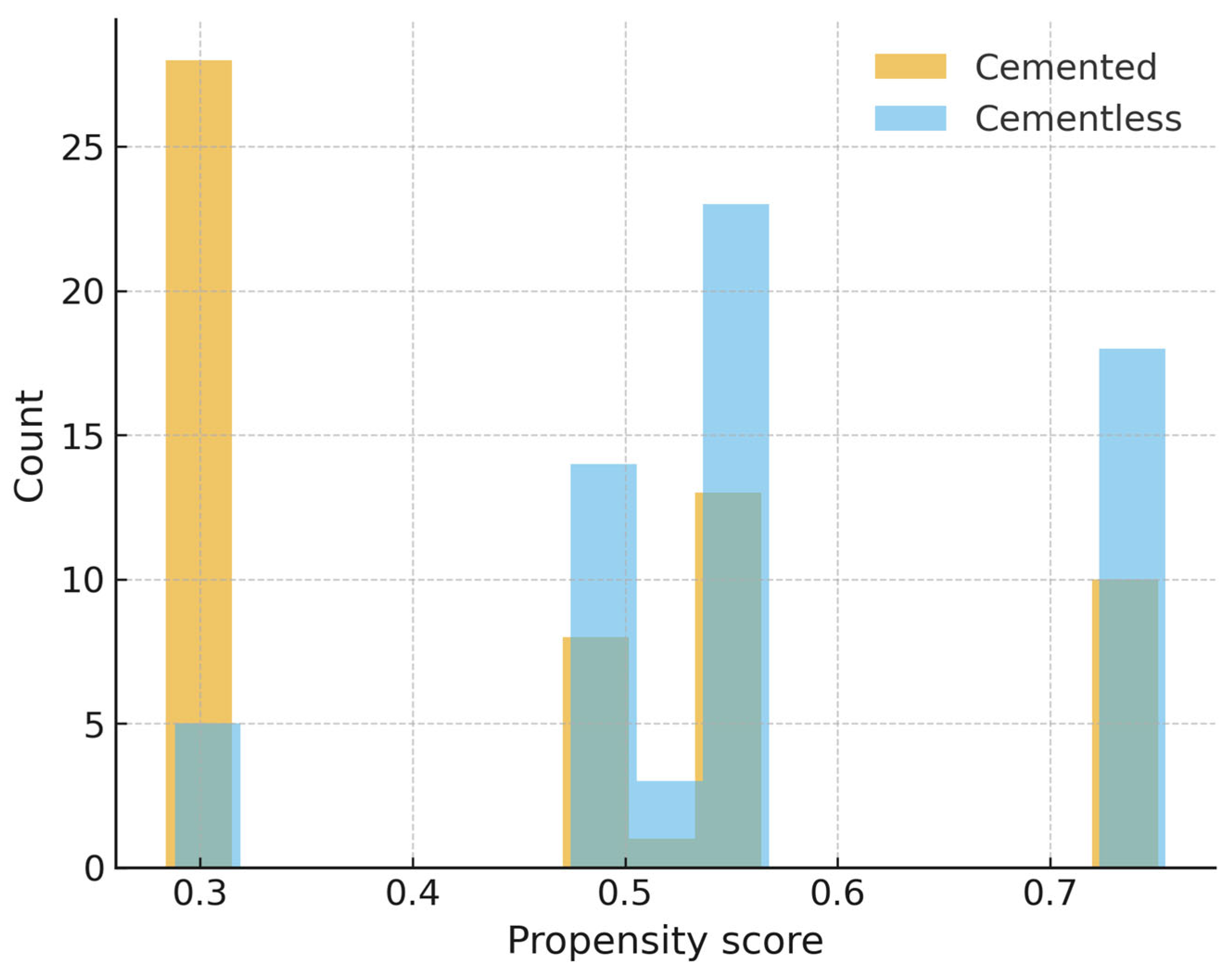 - Sohn, S.; Cho, N.; Oh, H.; Kim, Y.D.; Jo, H.; Koh, I.J. No Blood Loss Increase in Cementless vs. Cemented Fixation Following Bilateral Total Knee Arthroplasty: A Propensity Score Matching Study. Medicina 2023, 59, 1458. [Google Scholar] [CrossRef]
