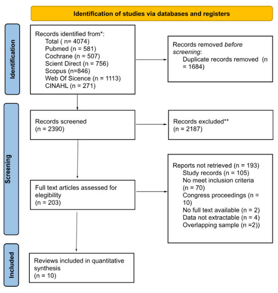 The search strategy identified a total of 4074 records from different databases (PubMed n = 581, Cochrane n = 507, Science Direct n = 756, Scopus n = 846, Web of Science n = 1113, and CINAHL n = 271). After removing 1684 duplicates, 2390 records were screened by title and abstract, of which 2187 were excluded for not meeting the inclusion criteria. A total of 203 full-text articles were assessed for eligibility. Of these, 193 reports were excluded: 105 were study records, 70 did not meet the inclusion criteria, 10 were congress proceedings, 2 were not available in full text, 4 did not provide extractable data, and 2 presented overlapping samples. Ultimately, 10 RCTs were included in the review and meta-analysis. The entire selection process is summarized in the PRISMA flow diagram (Figure 1).