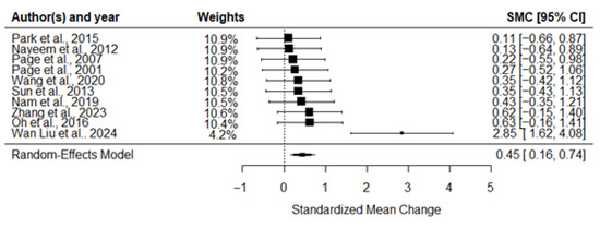 Forest plot for the overall effect size. The analysis includes the following studies: Nam et al., 2019 [43]; Nayeem et al., 2012 [50]; Oh et al., 2016 [44]; Page et al., 2001 [51]; Page et al., 2007 [46]; Park et al., 2015 [47]; Sun et al., 2013 [48]; Wan Liu et al., 2024 [45]; Wang et al., 2020 [49]; Zhang et al., 2023 [52].