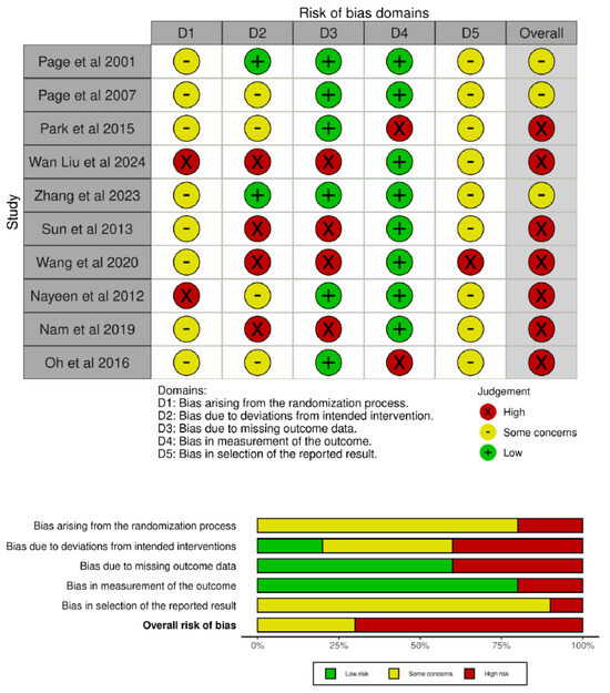 The crossover trial [44] was also assessed as “High Risk”. The primary concern was the potential for carryover effects between treatment periods, which were not adequately accounted for in the study design or statistical analysis. In addition, both domain 1 (randomization process) and domain 1b (period and carryover effects) were judged as “Some Concerns”; however, for clarity, these were unified in Figure 3.