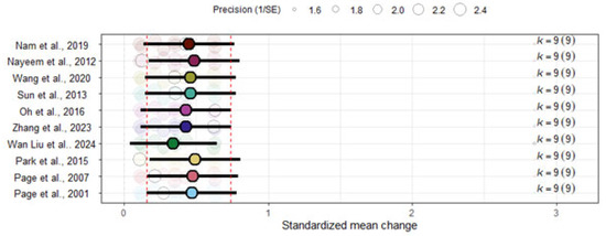 The meta-regression using the PEDro scale as a moderator showed that the overall ES was not affected by the methodological quality of the primary studies (b = −0.15, 95%CI: −0.69, 0.39, p = 0.544), nor was it statistically significantly higher in studies with high risk of bias according to the RoB scale (b = 0.17, 95%CI: −0.68, 1.02, p = 0.656).