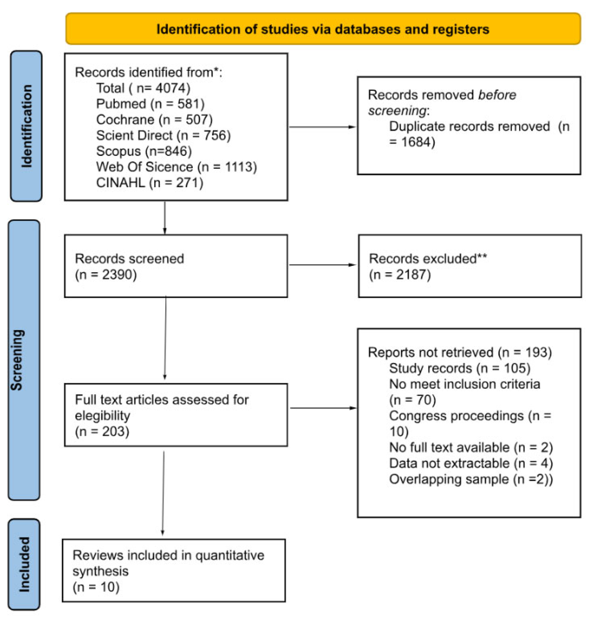 The search strategy identified a total of 4074 records from different databases (PubMed n = 581, Cochrane n = 507, Science Direct n = 756, Scopus n = 846, Web of Science n = 1113, and CINAHL n = 271). After removing 1684 duplicates, 2390 records were screened by title and abstract, of which 2187 were excluded for not meeting the inclusion criteria. A total of 203 full-text articles were assessed for eligibility. Of these, 193 reports were excluded: 105 were study records, 70 did not meet the inclusion criteria, 10 were congress proceedings, 2 were not available in full text, 4 did not provide extractable data, and 2 presented overlapping samples. Ultimately, 10 RCTs were included in the review and meta-analysis. The entire selection process is summarized in the PRISMA flow diagram (Figure 1).