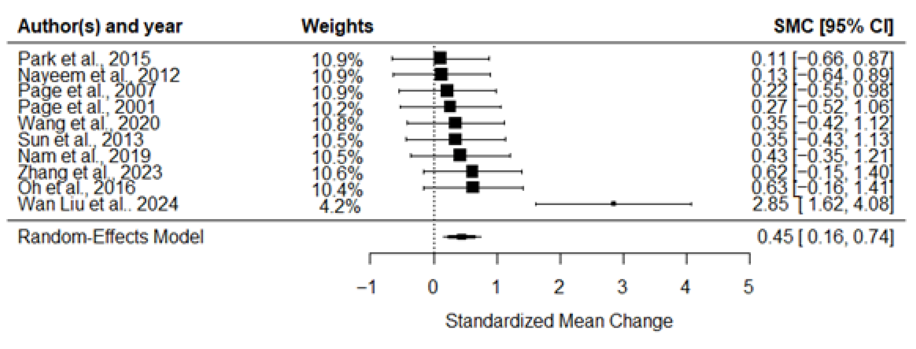 Figure 2. Forest plot for the overall effect size. The analysis includes the following studies: Nam et al., 2019 [43]; Nayeem et al., 2012 [50]; Oh et al., 2016 [44]; Page et al., 2001 [51]; Page et al., 2007 [46]; Park et al., 2015 [47]; Sun et al., 2013 [48]; Wan Liu et al., 2024 [45]; Wang et al., 2020 [49]; Zhang et al., 2023 [52].