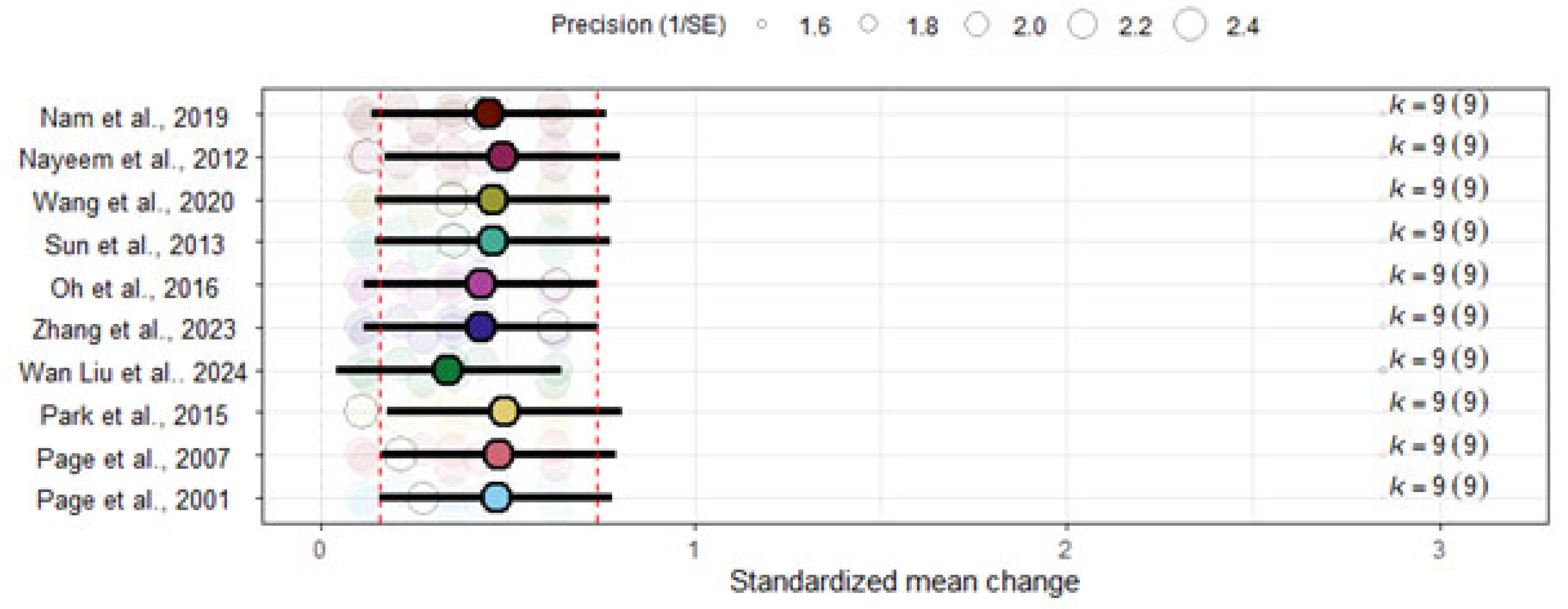 Figure 4. Leave-one-out sensitivity analysis of overall effect size. The analysis includes the following studies: Nam et al., 2019 [43]; Nayeem et al., 2012 [50]; Oh et al., 2016 [44]; Page et al., 2001 [51]; Page et al., 2007 [46]; Park et al., 2015 [47]; Sun et al., 2013 [48]; Wan Liu et al., 2024 [45]; Wang et al., 2020 [49]; Zhang et al., 2023 [52].