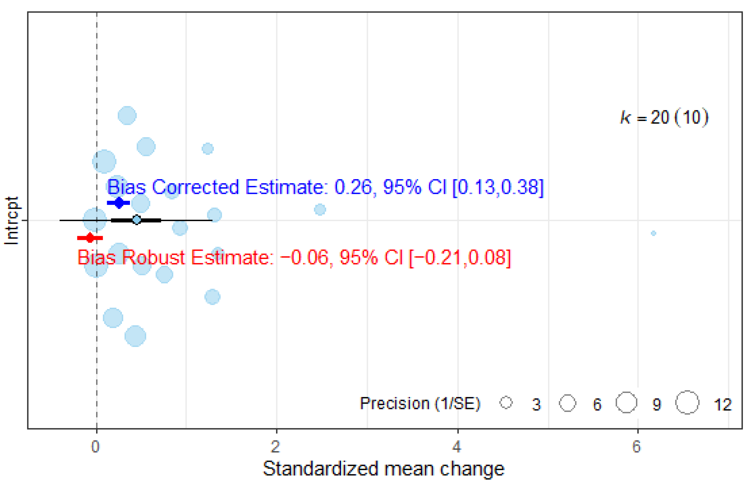 10 RCTs (n = 255)Very seriousSerious (I2 = 88.2%)No seriousSeriousVery seriousES = 0.45 (0.16, 0.74) Adjusted ES = −0.06 (−0.21, −0.08)Very Low
