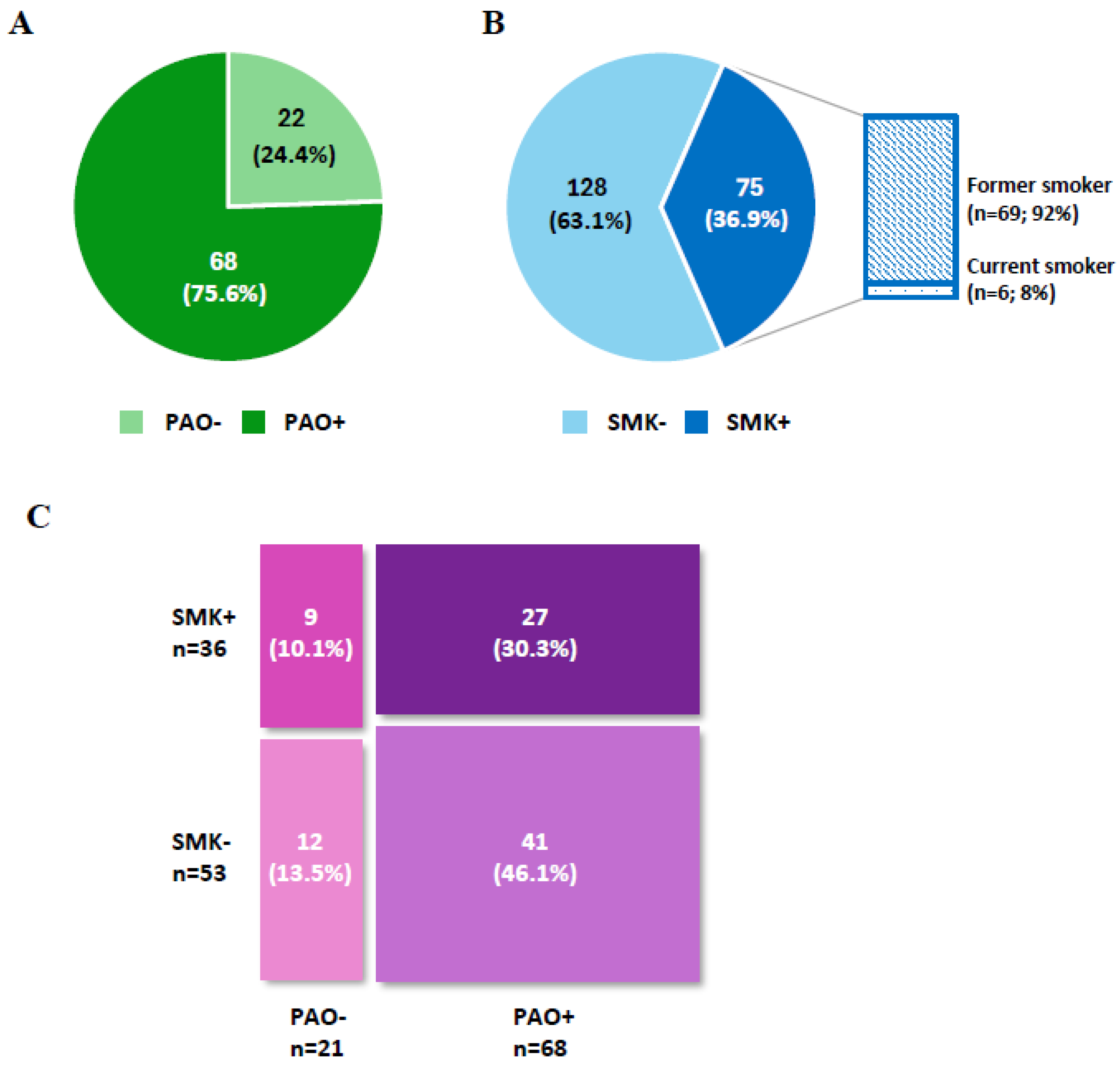| Variables | PAO− n = 22 | PAO+ n = 68 | SMK− n = 128 | SMK+ n = 75 |