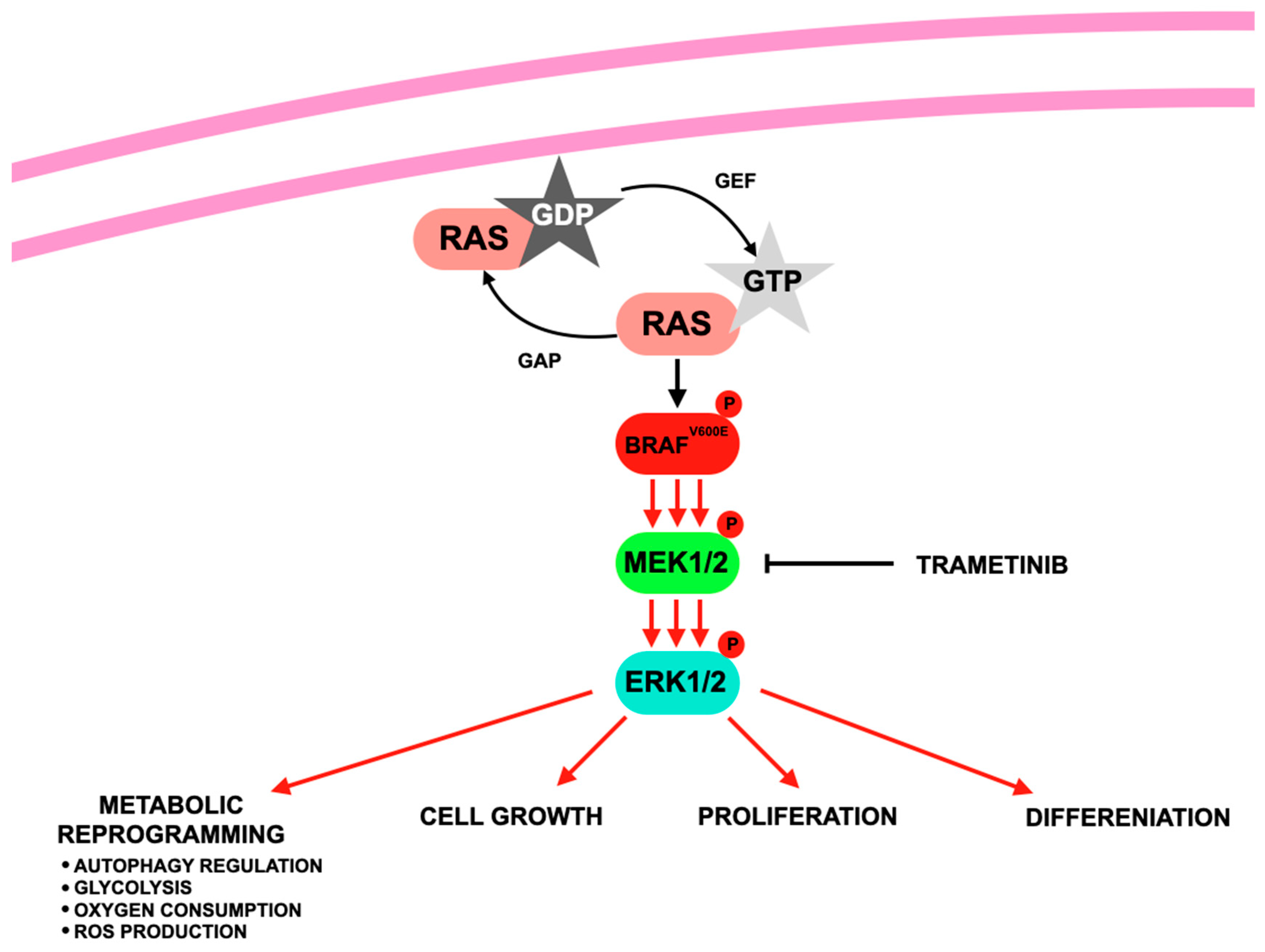 - Song, Y.; Bi, Z.; Liu, Y.; Qin, F.; Wei, Y.; Wei, X. Targeting RAS-RAF-MEK-ERK Signaling Pathway in Human Cancer: Current Status in Clinical Trials. Genes Dis. 2022, 10, 76–88. [Google Scholar] [CrossRef] [PubMed]