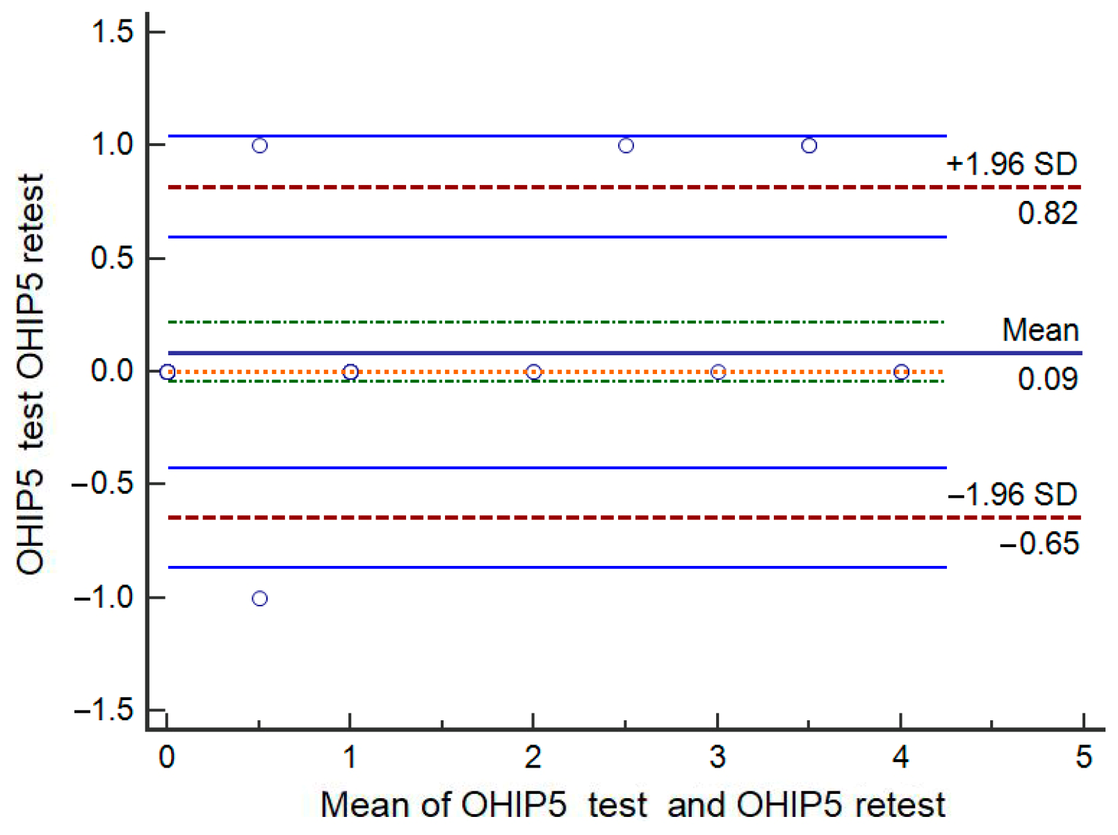 - Limpuangthip, N.; Wannakhao, P. Validation, measurement properties, and minimal clinically important difference of short-version oral health impact profile (OHIP-5) by type of prosthodontic treatment: A prospective cohort study. BMC Oral Health 2025, 25, 1701. [Google Scholar] [CrossRef]