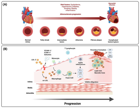 Pathophysiology of atherosclerosis and inflammation in ACS. (A) Atherosclerotic progression from fatty streaks to complicated lesions and rupture is accelerated by dyslipidemia, diabetes, hypertension, obesity, smoking, and systemic inflammation. (B) Endothelial activation and LDL infiltration drive monocyte recruitment, foam cell formation, and necrotic core expansion. NLRP3 inflammasome activation amplifies cytokine release (IL-1β, IL-18, IL-6, and TNF-α), promoting plaque destabilization, thrombosis, and systemic residual inflammatory risk reflected by circulating biomarkers (CRP and IL-6).