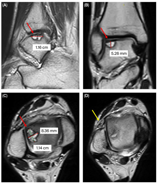 MRI of the right ankle joint showing the osteochondral lesion in the lateral talar dome (red arrow): (A) sagittal, (B) coronal, (C) axial; and an anterior talofibular ligament injury (yellow arrow) (D).