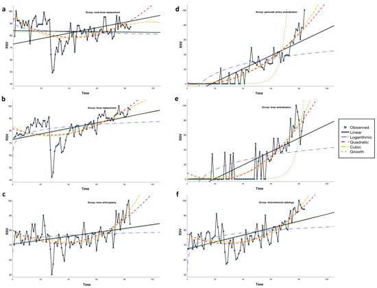 (a–f). Observed and modeled monthly relative search volume (RSV) trends for six knee osteoarthritis-related search terms (2018–2024). Panels show fitted curves for (a) “total knee replacement”, (b) “knee replacement”, (c) “knee arthroplasty”, (d) “genicular artery embolization”, (e) “knee embolization”, and (f) “interventional radiology”. Models include linear, logarithmic, quadratic, cubic and growth fits, illustrating steeper increase for minimally invasive terms compared to traditional surgical procedures.