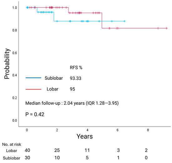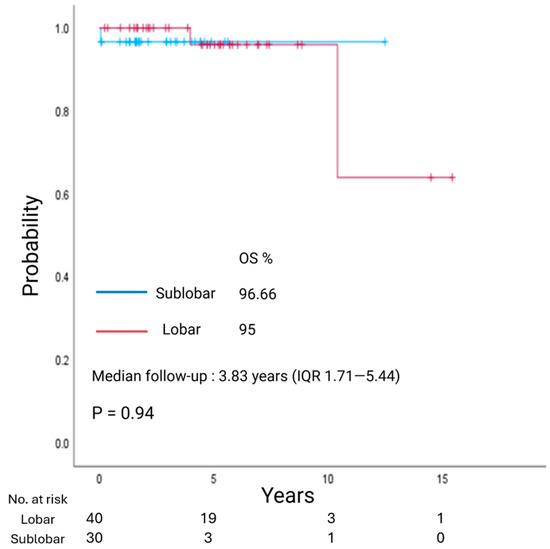 | Parameter | Total (n = 70) | Lobar (n = 40) | Sublobar (n = 30) | p-Value |