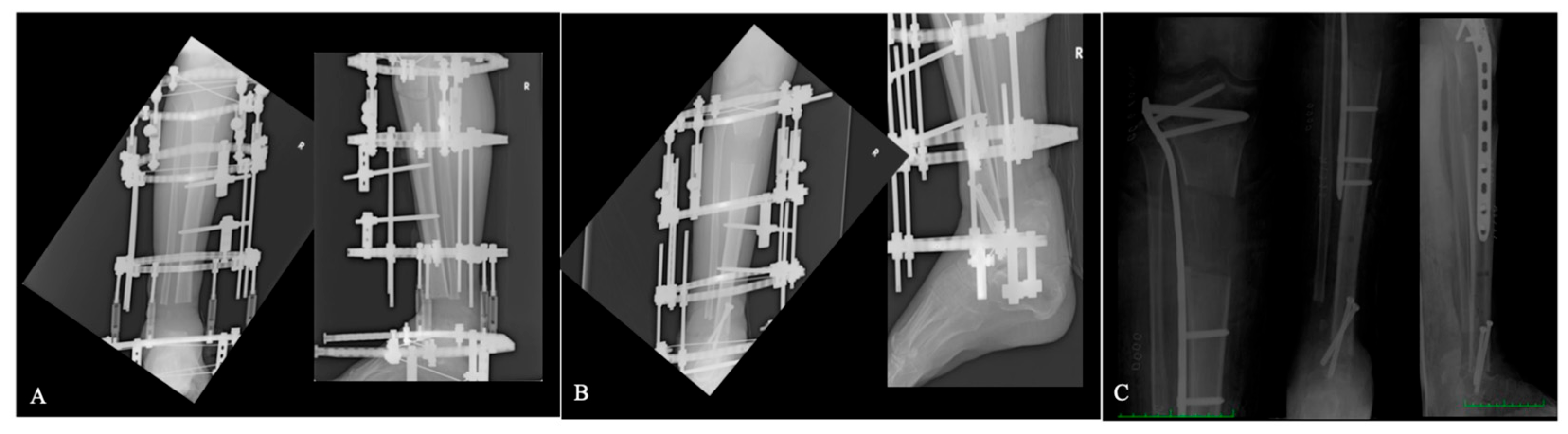 - Sarangi, G.; Mishra, S.; Das, T.K.; Acharya, R.; Sharma, A. Assesment of Functional and Radiological Outcomes of Proximal Tibia Fractures Surgically Treated with Ilizarov Fixators. Cureus 2025, 17, e79464. [Google Scholar] [CrossRef]