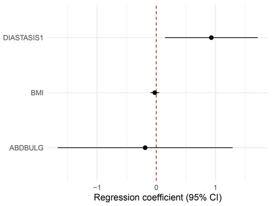 A forest plot of the multivariate analysis that shows a statistically significant influence of diastasis plication on the “Physical well-being: abdomen” scale, even when controlling for potentially confounding factors like BMI and bulging (see also Table 3).