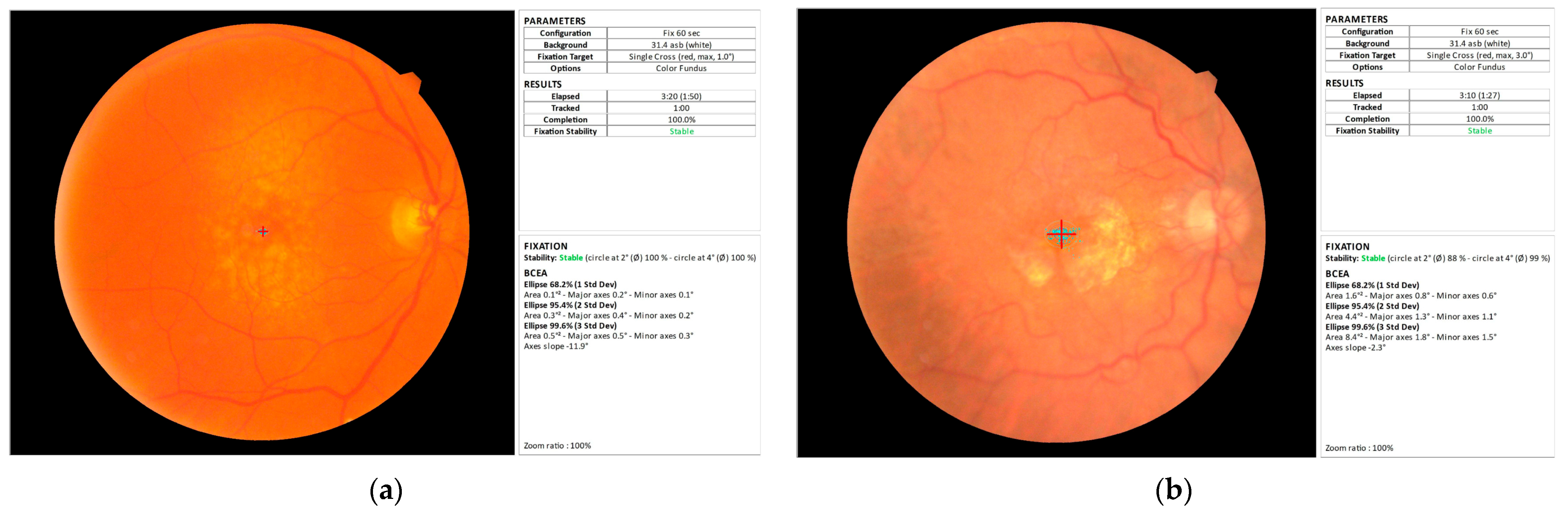 - Crossland, M.D.; Dunbar, H.M.; Rubin, G.S. Fixation stability measurement using the MP1 microperimeter. Retina 2009, 29, 651–656. [Google Scholar] [CrossRef]