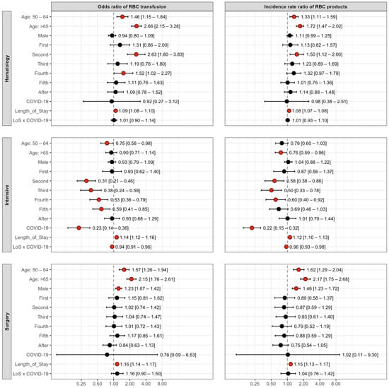 At the Department of Surgery, older age groups and male patients had higher odds of receiving RBC transfusions and were administered a higher rate of units compared to their respective reference groups (18–49 years and female). The pandemic waves did not significantly alter transfusion practices in this department compared to the pre-pandemic baseline. Length of stay was a highly significant predictor, where each additional day increased the odds of transfusion by 16% (OR = 1.16, 95% CI: 1.14–1.17) and the rate of units by 15% (IRR = 1.15, 95% CI: 1.13–1.17). A COVID-19 diagnosis did not have a statistically significant impact on the odds or rate of RBC transfusion for surgical patients.