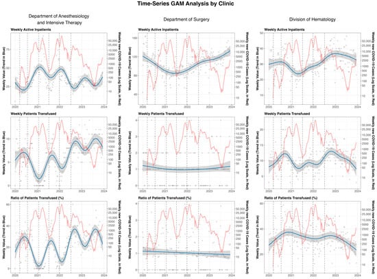 To explore temporal patterns in transfusion practices, weekly aggregated metrics (e.g., number of active inpatients, number of patients transfused) were computed. This analysis focused on case-based modeling. Time-series data analysis required raw weekly data points to be plotted against time. To aid in the interpretation of underlying trends, a smoothed line with a 95% confidence interval were overlaid on each plot using a GAM-based smoother (geom_smooth (method = “gam”)) visual method. This was performed for descriptive visualization purposes to highlight patterns, rather than for formal statistical inference.