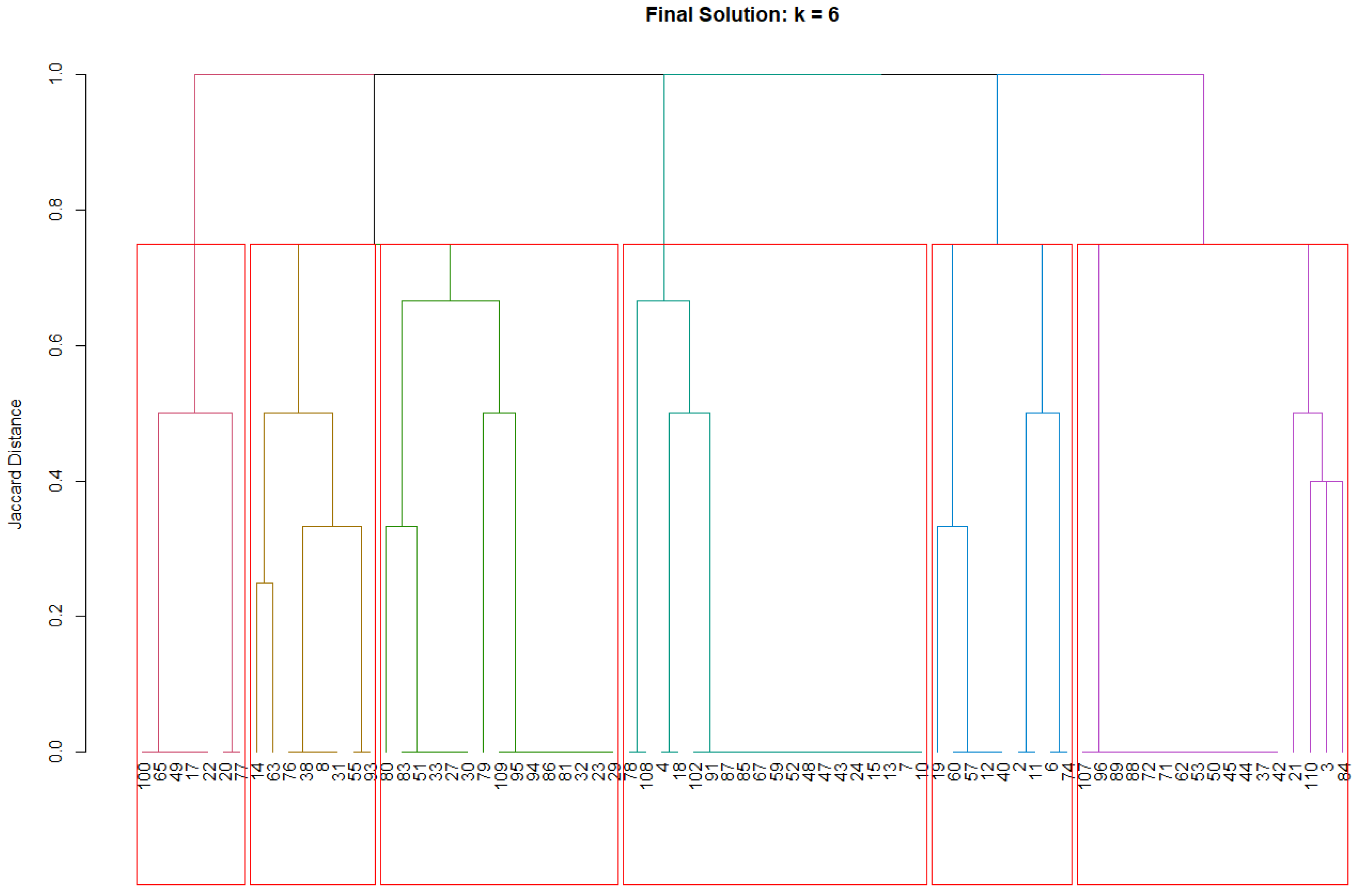 | Cluster 1 (n = 7, 9.3%) | Cluster 2 (n = 14, 18.7%) | Cluster 3 (n = 20, 26.7%) | Cluster 4 (n = 9, 12%) | Cluster 5 (n = 10, 13.3%) | Cluster 6 (n = 15, 20%) | |