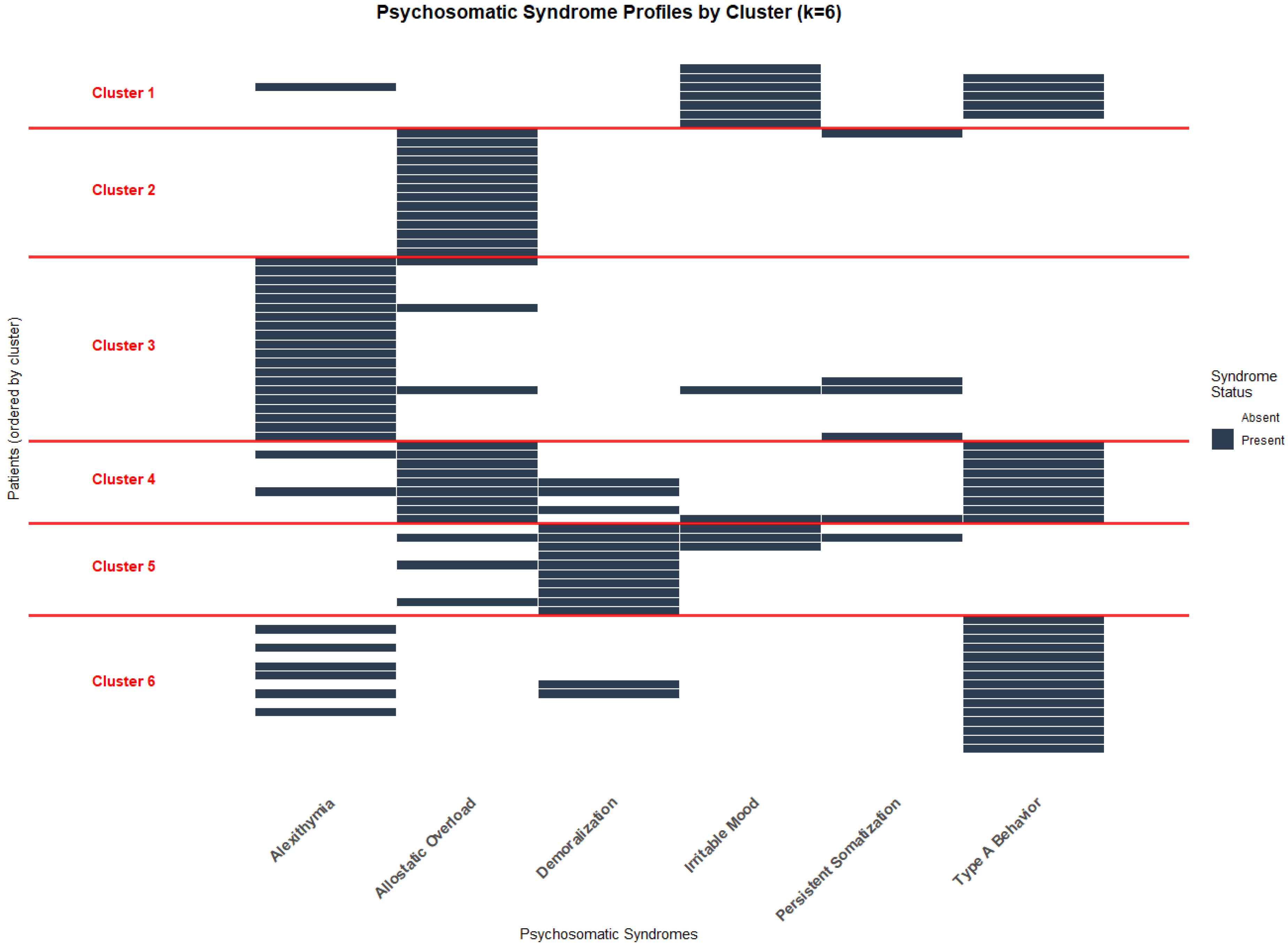 - Partial correspondence was observed between cluster 4 of the 6-syndrome solution (allostatic overload and type A behavior with demoralization) and Cluster 3 of the 5-syndrome solution (allostatic Overload with type A Behavior).