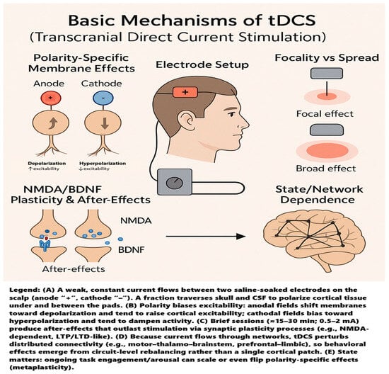 Transcranial direct current stimulation (tDCS) is a noninvasive way to nudge brain activity by running a small, steady direct current across the scalp through two or more saline-soaked sponge electrodes—typically an anode and a cathode—positioned on the head []. The method is painless, well-tolerated, and safe, with only a few mild side effects reported []. A compact, battery-powered device delivers 0.5–2 mA of current, a fraction traversing the skull to influence cortical neurons. Polarity matters: anodal stimulation tends to depolarize neurons and raise their excitability, whereas cathodal stimulation usually hyperpolarizes them and dampens activity [,]. Because current flows between the pads, conventional tDCS affects a relatively broad area; using smaller electrodes can make the effect more focal []. Standard sessions that last 15–30 min to 20 min are common, producing physiological changes that outlast the stimulation. Even three minutes can leave detectable after-effects, and ten or more minutes at 1–2 mA can stabilize these changes for at least an hour [,]. A single 15 min session can modulate cortical excitability for roughly 90 min, with repeated sessions extending the duration of these effects [,,]. These after-effects are thought to arise from subtle shifts in membrane polarization that bias synaptic plasticity, rather than from direct neuronal firing []. Indeed, multiple studies show that tDCS can induce long-lasting, LTP-like or LTD-like changes in the cortex, consistent with Hebbian-style learning []. This plasticity depends critically on NMDA receptor signaling and modulators such as BDNF; for example, pairing anodal polarization with low-frequency input can yield persistent LTP in rodent cortex, an effect abolished by NMDA antagonists []. Crucially, these mechanisms are context-dependent. The brain’s ongoing state-rest vs. task engagement, arousal level, even time of day, can shape, blunt, or sometimes reverse the expected polarity-specific outcomes (so-called metaplasticity) [,]. And tDCS does not act in isolation on a single cortical patch: altering one node (e.g., M1) perturbs activity across connected networks []. Neuroimaging confirms shifts in large-scale functional connectivity under tDCS, meaning behavioral effects emerge from the state of the broader network, not just the stimulated site [,]. The basic mechanisms of tDCS are illustrated in Figure 1.