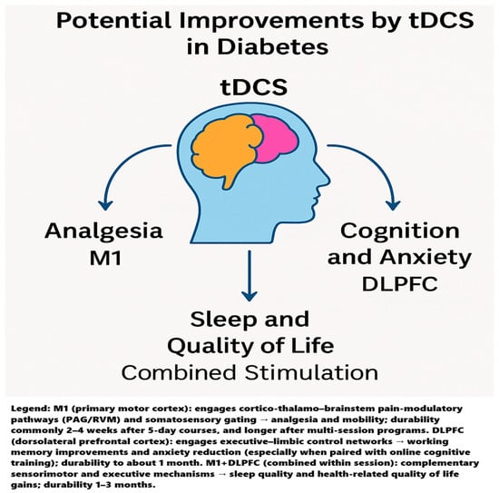 Transcranial direct current stimulation (tDCS) is being explored as an adjunct for diabetes-related symptoms grounded in diabetes-associated alterations in brain networks. We reviewed clinical trials of tDCS conducted in people with diabetes and summarized mechanistic findings relevant to metabolic control. Two reviewers searched PubMed/MEDLINE, Cochrane Library, Google Scholar, Scopus, and ResearchGate for studies published from 1 January 2008 to 31 August 2025. Forty-one records were identified; after screening and full-text assessment, 11 studies met the inclusion criteria. Across predominantly middle-aged adults with long-standing type 2 diabetes, protocols were low-intensity and well-tolerated. The most consistent clinical benefit was analgesia with primary motor cortex stimulation, with randomized comparisons favoring active tDCS over sham. Dorsolateral prefrontal stimulation paired with working-memory training improved cognition and reduced anxiety, while combined motor–prefrontal courses yielded gains in sleep quality and health-related quality of life; a small, randomized study in proliferative diabetic retinopathy reported short-term visual improvements after occipital stimulation. Safety was favorable, and no serious adverse events were reported. Objective metabolic endpoints in diabetic cohorts were scarce; early evidence for insulin-independent improvements in glucose handling and neurometabolic shifts derives mainly from non-diabetic or mixed samples and remains hypothesis-generating. Overall, tDCS appears to be a promising, well-tolerated adjunct for diabetes-related complications. Larger, rigorously sham-controlled trials that align targets with clinical phenotypes and include standardized metabolic outcomes are needed.