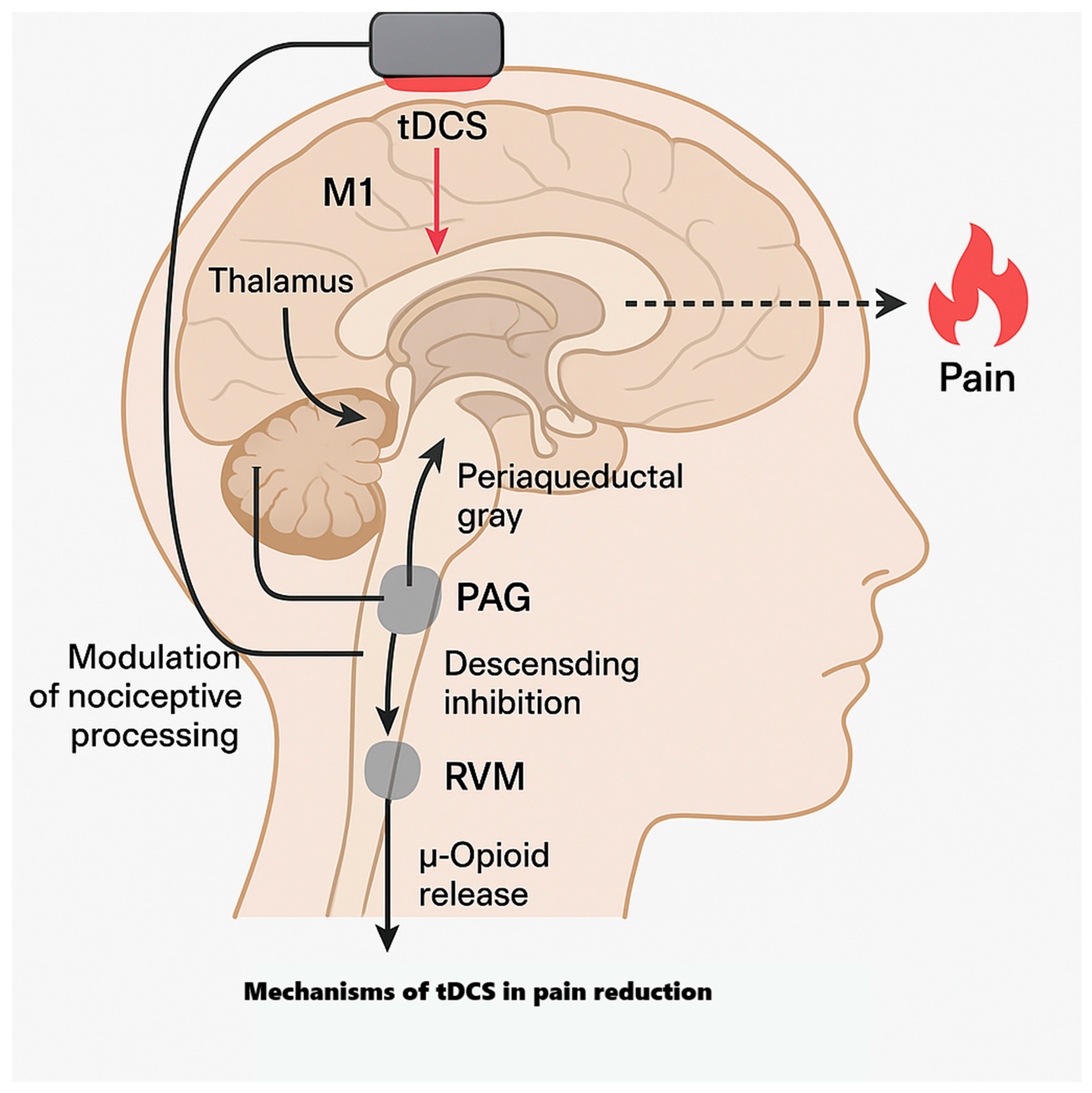 - Caumo, W.; Franca, B.R.; Orzechowski, R.; Bueno, G.; França, A.; Dos Santos da Silva, J.V.; Sanches, P.R.S.; Da Silva, D.P., Jr.; Torres, I.L.S.; Hirakata, V.N.; et al. Home-Based Transcranial Direct Current Stimulation vs Placebo for Fibromyalgia: A Randomized Clinical Trial. JAMA Netw. Open 2025, 8, e2514262. [Google Scholar] [CrossRef]