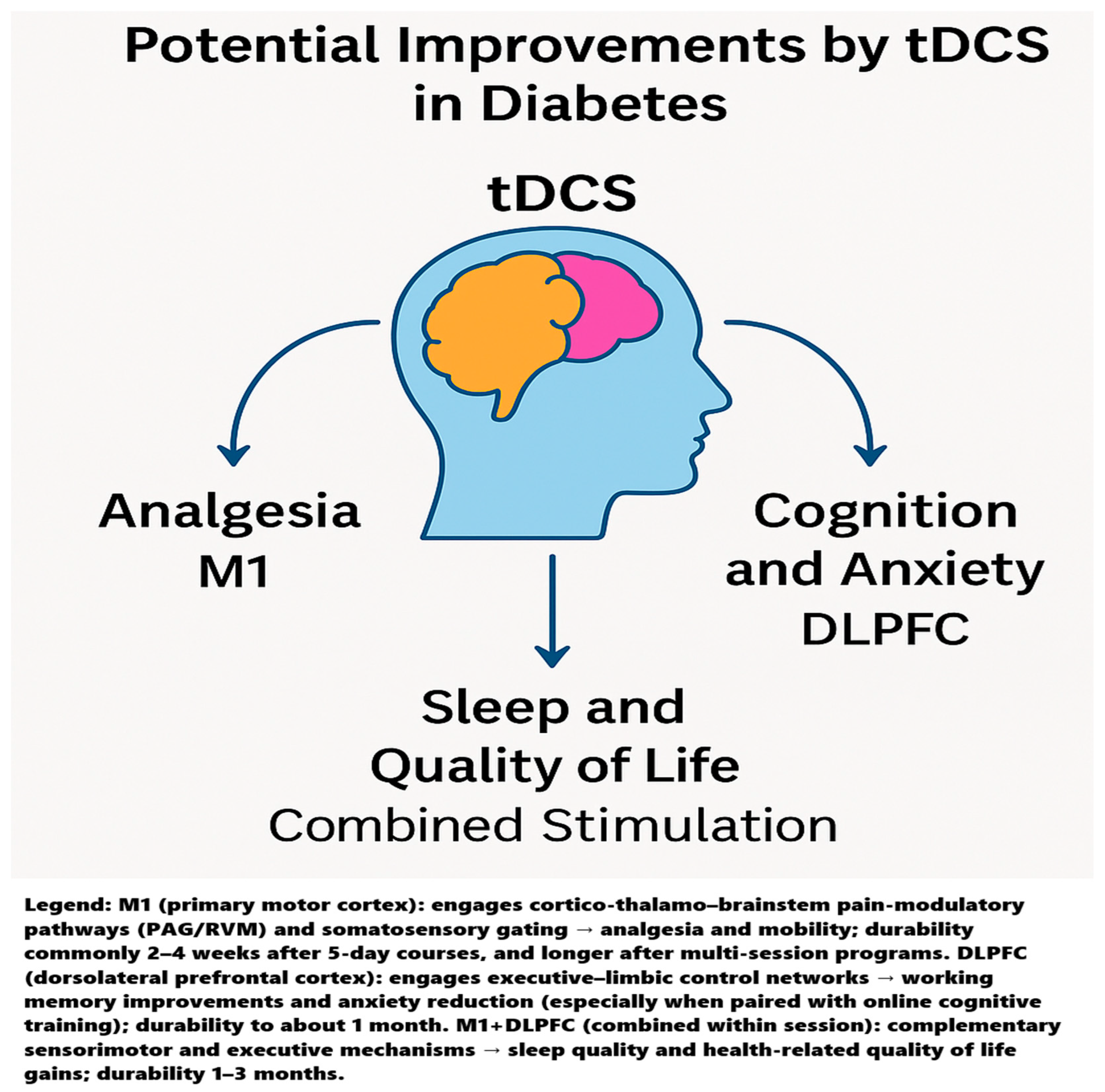 Chmiel, J.; Kurpas, D. Transcranial Direct Current Stimulation (tDCS) in Diabetes: A Focused and Mechanistic Review of Symptom and Function Outcomes. J. Clin. Med. 2025, 14, 7945. https://doi.org/10.3390/jcm14227945