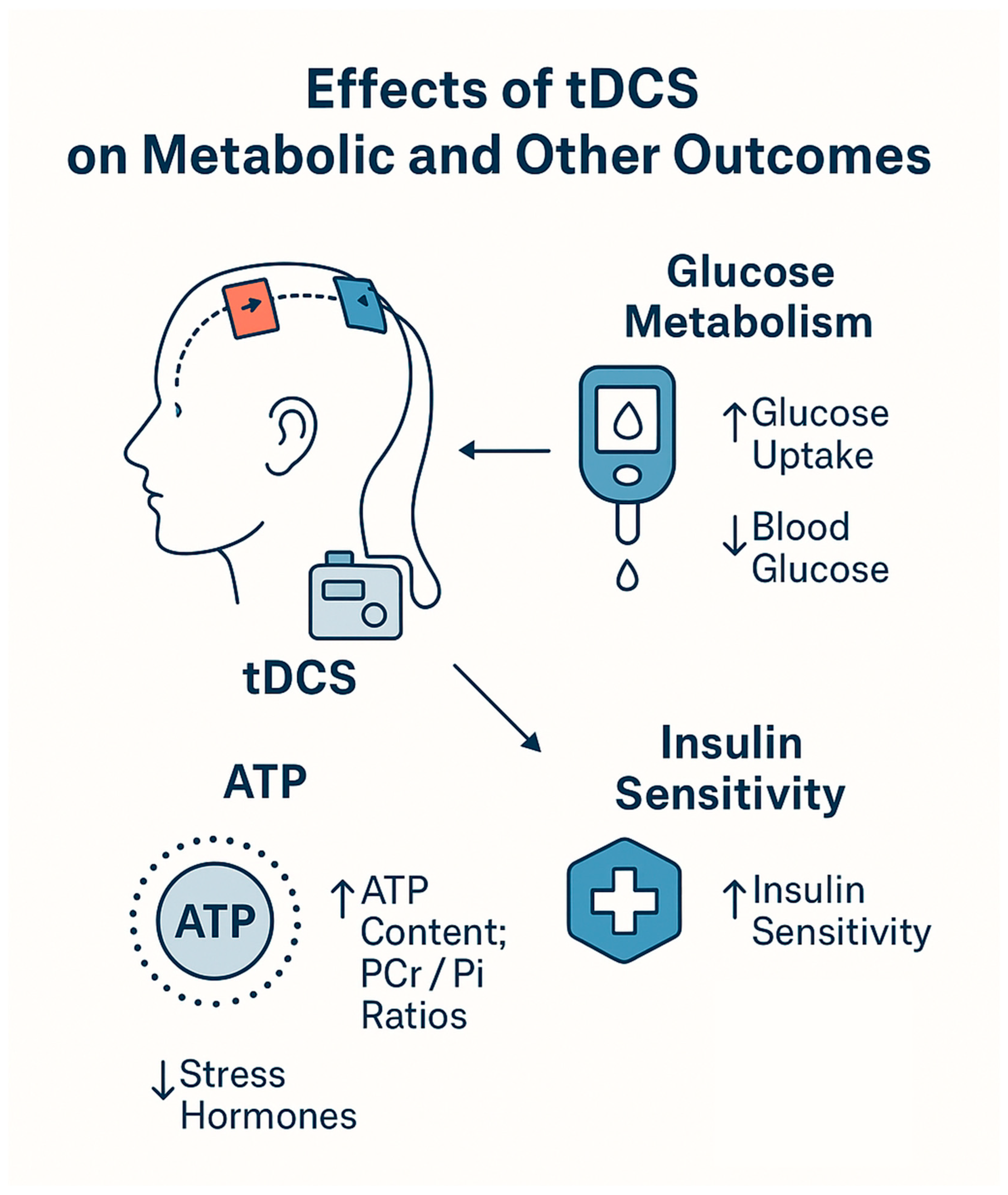 | Ester-Nacke et al., 2025 [170], Germany | n = 44 (mean age 36 y; BMI 30.6; overweight/obese adults) | Randomized, double-blind, parallel; three sessions, 25 min, 12-electrode net montage | Hypothalamus appetite-control network | Oral glucose tolerance test (oGTT), fasting glucose, insulin, HbA1c, ISI Matsuda | No significant changes in glucose, insulin, ISI, or HbA1c; anodal tDCS ↓ sweet food intake (p = 0.037) and improved inhibitory control (↓ SSRT); ↑ hypothalamic connectivity on fMRI |