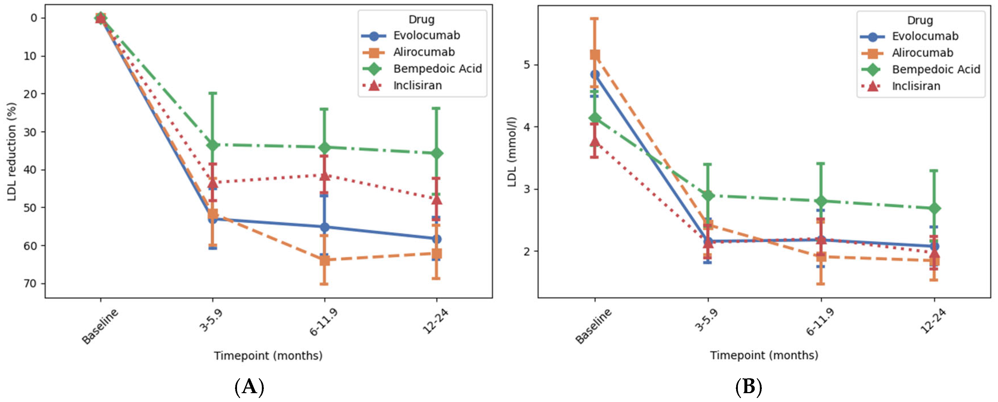 Figure 1. Association of novel lipid-lowering medications with reduction in LDL cholesterol at different time points. Time intervals were used to account for variation in timing of follow-up blood tests in this retrospective study. Panels (A) and (B) show the percentage change and the absolute reduction in low-density LDL-C level over time, respectively. Change in LDL-C levels from baseline to 12–24 months was analysed using ANOVA followed by post hoc correction for multiple comparisons. There was a significant reduction in LDL-C with all drugs (all p < 0.001) (Supplementary Table S1). Error bars represent 95% confidence interval around the mean.
