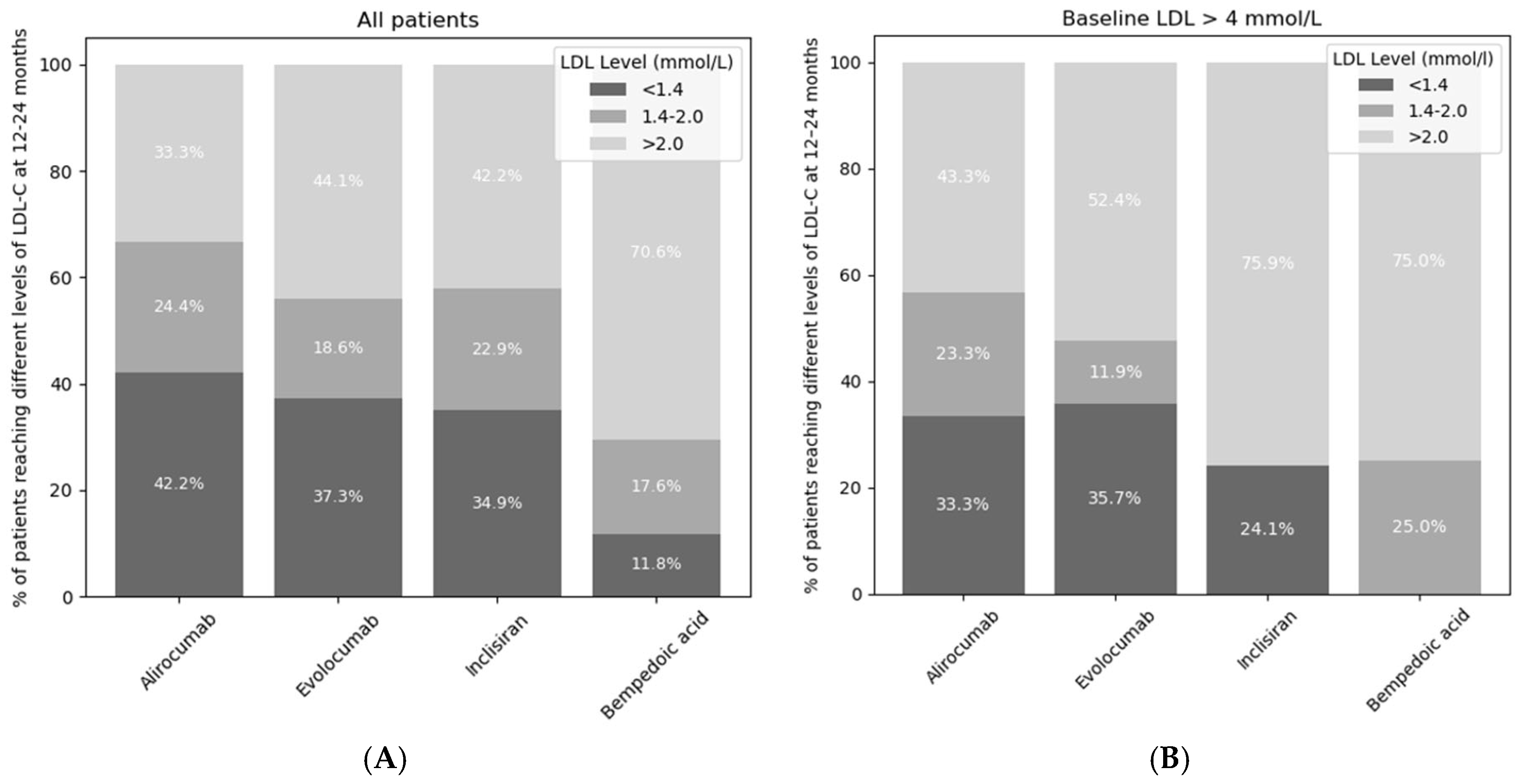 The primary aim of the study was to assess the proportion of patients with cardiovascular disease that achieve guideline-recommended LDL-C targets in a routine clinical setting. The main findings of this study are as follows: (1). The ESC target of LDL < 1.4 mmol/L was achieved with alirocumab, evolocumab, or inclisiran in approximately 40% of patients. In contrast, a significantly lower proportion of patients receiving bempedoic acid reached this target. (2). Monoclonal PCSK9 inhibitors were associated with greater reductions in LDL-C than inclisiran. (3). Among patients with high baseline LDL-C (>4 mmol/L), those treated with monoclonal PCSK-9 inhibitors were more likely to achieve guideline-recommended LDL-C targets compared to those receiving inclisiran.
