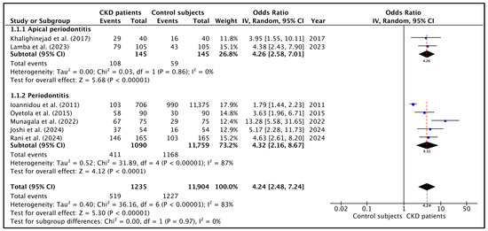 Sensitivity analysis excluding the study with the most extreme effect size [45] reduced the pooled OR from 4.9 to 3.5, but the association remained statistically significant (p < 0.001). Separate analyses excluding studies without standardized definitions of periodontitis and those based exclusively on dialysis populations indicated that the observed association was not due to any particular study or methodological variability between subgroups.