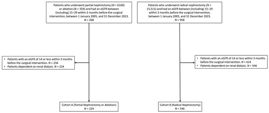 Cohort selection process for patients with stage 4 chronic kidney disease who underwent partial nephrectomy, ablation, or radical nephrectomy between 1 January 2005, and 31 December 2023. Patients with an eGFR ≤ 14 within 3 months before surgery or dependence on renal dialysis were excluded. The final cohorts, before matching, included 224 patients in Cohort A (partial nephrectomy or ablation) and 546 patients in Cohort B (radical nephrectomy).