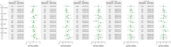 Comparison of the risk ratios for electrolyte and metabolic abnormalities between Cohort A (partial nephrectomy or ablation) and Cohort B (radical nephrectomy) across various postsurgical time intervals. This figure illustrates the risk ratios (RRs) and corresponding 95% confidence intervals (CIs) for electrolyte and metabolic abnormalities between Cohort A and Cohort B. The data are stratified across five postoperative time intervals: 3 days–1 week, 1 week–1 month, 1 month–3 months, 3 months–6 months, and 6 months–1 year. The outcomes include abnormalities in pH, bicarbonate, sodium, potassium, calcium, magnesium, and phosphate levels. Each dot represents the RR with its 95% CI, with Cohort A (partial nephrectomy or ablation) serving as the reference group.