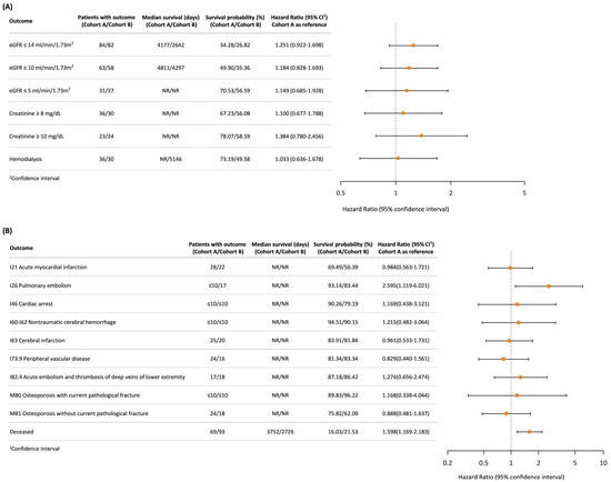 Comparison of renal function outcomes and long-term vascular and skeletal events between (A) Cohort A (partial nephrectomy or ablation) and (B) Cohort B (radical nephrectomy). Each dot represents the hazard ratio (HR) with its 95% confidence interval (CI).