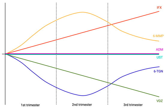 IFX levels appear to increase throughout pregnancy trimesters, which remains true even when accounting for the variable changes in BMI, albumin, and CRP, suggesting decreased drug clearance during pregnancy [,]. The increase has been calculated as 0.16 µg/mL/week, or 6.4 µg/mL over a 40-week pregnancy []. This may be because of increased neonatal Fc receptor expression during pregnancy, which enhances IFX recycling []. By contrast, adalimumab shows little change through pregnancy [,]. Thiopurines display a different pattern, with 6-TGN levels falling and 6-methylmercaptopurine (MMP) levels increasing in the second trimester before returning back towards pre-pregnancy levels in the third trimester []. This has implications for potentially increased hepatotoxicity with reduced drug efficacy during pregnancy. Ustekinumab levels appear stable throughout pregnancy [,], whereas vedolizumab levels tend to decline in association with weight gain; the clinical significance is uncertain [,]. There is a lack of evidence for the effect of pregnancy on mirikizumab and risankizumab PKs. Whilst the small molecules tofacitinib, filgotinib, upadacitinib, ozanimod, and etrasimod are contraindicated during pregnancy due to teratogenicity, major societies strongly recommend continuing anti-TNFα drugs and thiopurines during pregnancy, as well as other non-anti-TNFα biologics, particularly if active or historically difficult-to-treat disease is present [,]. This is because of their well-documented safety in pregnancy, with any detectable risk outweighed by the risk to mother and child of flare after drug discontinuation [,,,,].