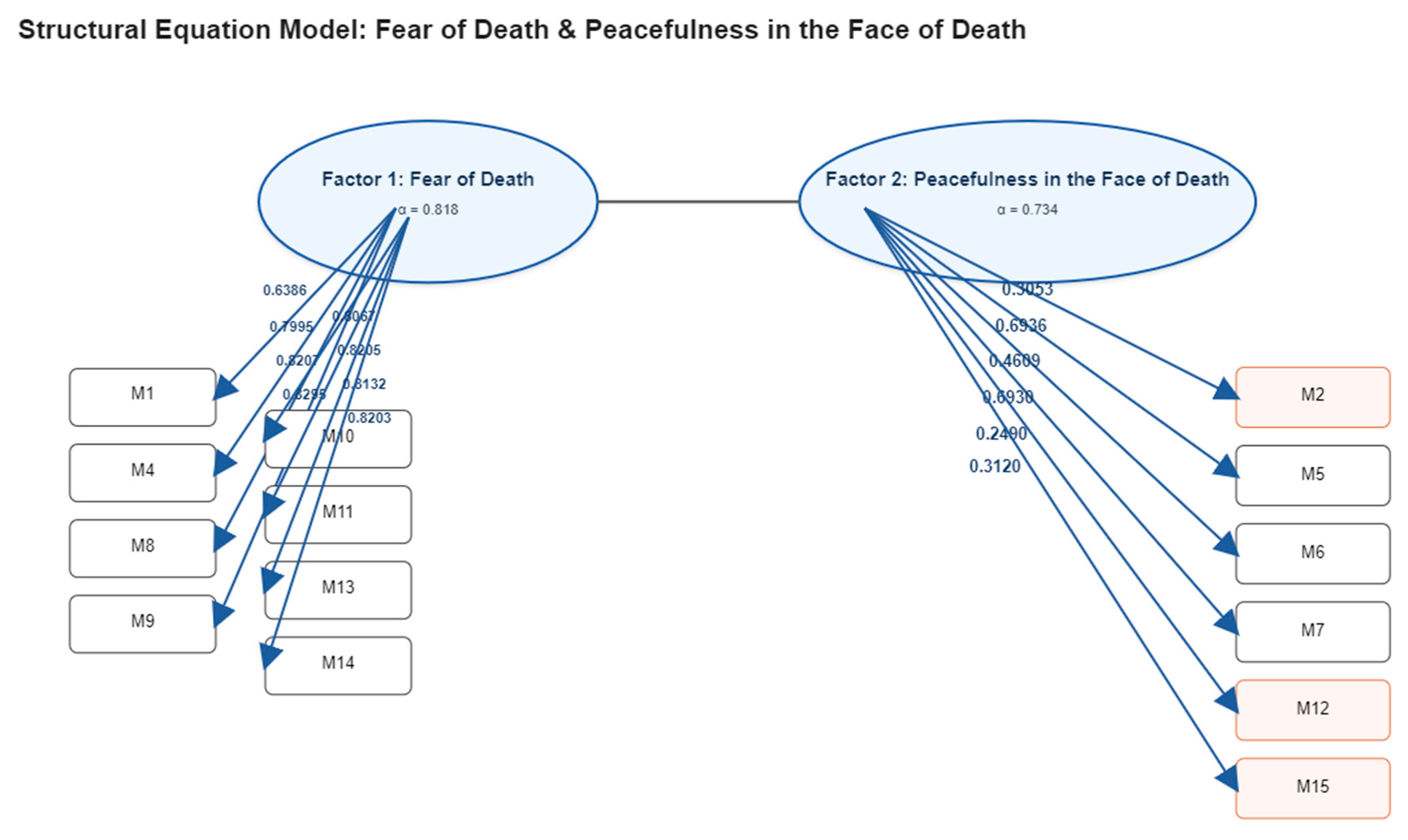 | Factor 2: “Serenity towards Death” | 0.734 | 0.62 | 1.51 | 20.71 | 99.80 |