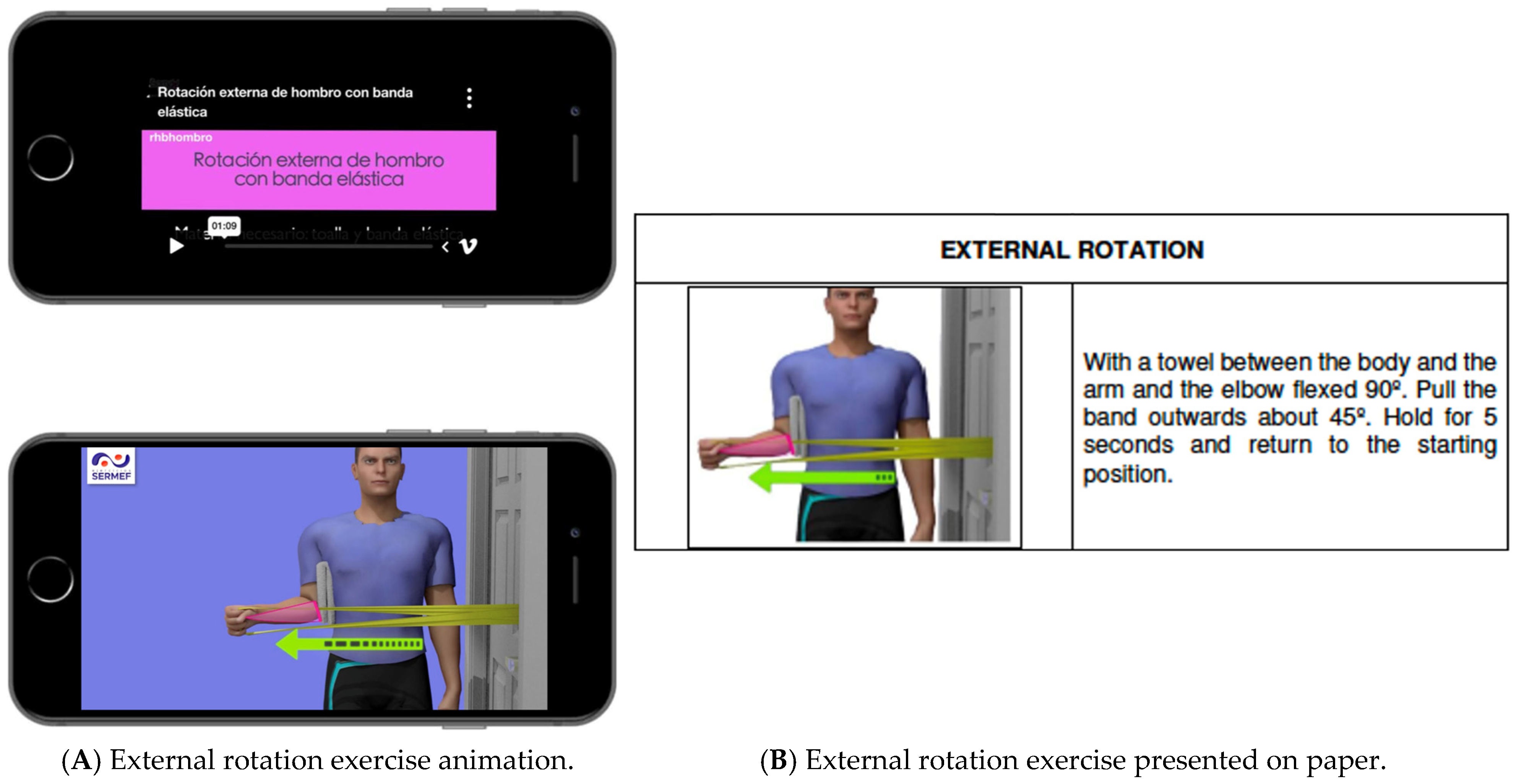- Pérez-Porta, I.; Flórez-García, M.T.; García-Pérez, F.; Fernández-Matías, R.; Pérez-Manzanero, M.Á.; Araujo-Narváez, A.M.; Urraca-Gesto, M.A.; Fernández-Lagarejos, C.; Plaza-Manzano, G.; Pérez-Fernández, E.; et al. Effects of a Web Application Based on Multimedia Animations to Support Therapeutic Exercise for Rotator Cuff-Related Shoulder Pain: Protocol for an Open-Label Randomised Controlled Trial. BMJ Open 2024, 14, e085381–e085386. [Google Scholar] [CrossRef] [PubMed]