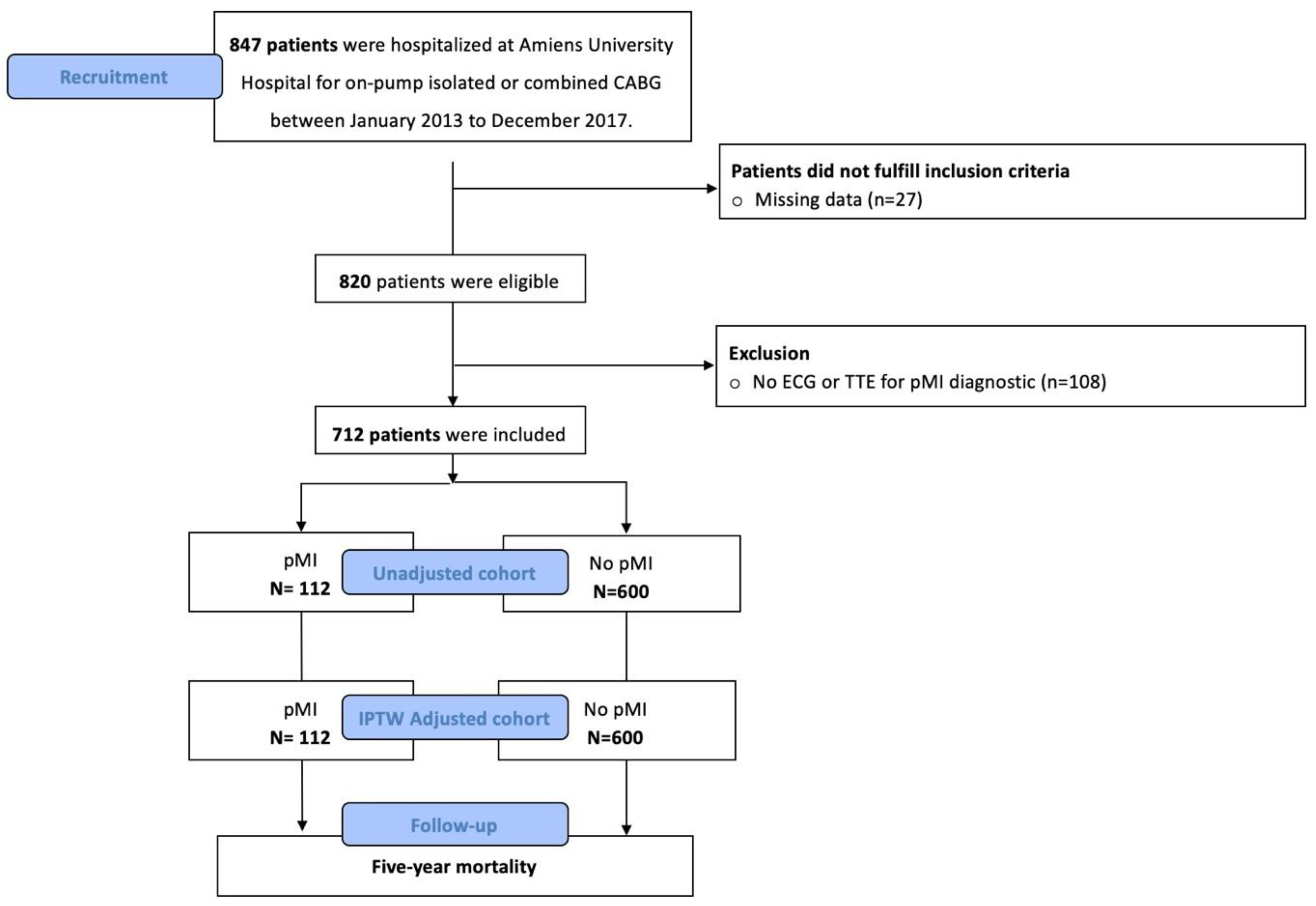 - Beyls, C.; Huette, P.; Huang, P.; Kowalik, H.; Andreamifidi-Berti, C.; Guilbart, M.; Bernasinsiki, M.; Besserve, P.; Touati, G.; Caus, T.; et al. Five-year mortality of patients with perioperative myocardial infarction after on-pump isolated or combined coronary artery bypass graft surgery: A retrospective propensity score-weighted analysis. Arch. Cardiovasc. Dis. 2024, 117, S25–S26. [Google Scholar] [CrossRef]